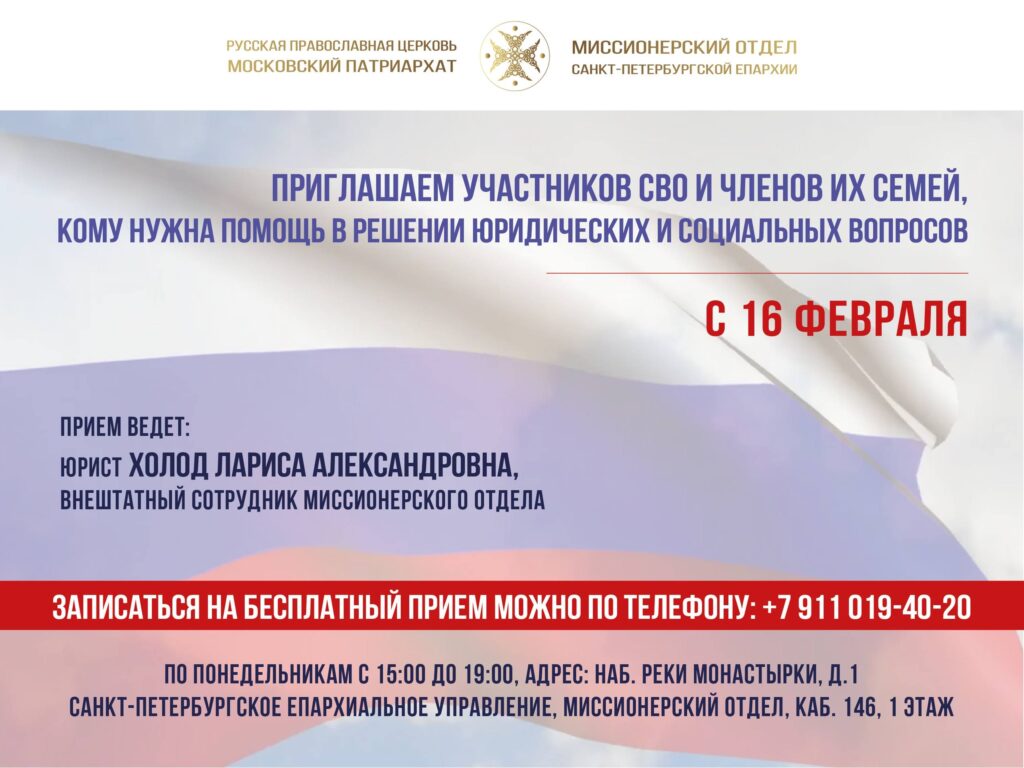 Бесплатный прием будет вести юрист Холод Лариса Александровна, наш волонтёр, внештатный сотрудник миссионерского отдела, имеющая большой опыт успешной судебной практики, взаимодействия с гос.органами, работы в адвокатуре, в т.ч. с льготными категориями граждан, среди которых также участники СВО и члены их семей.